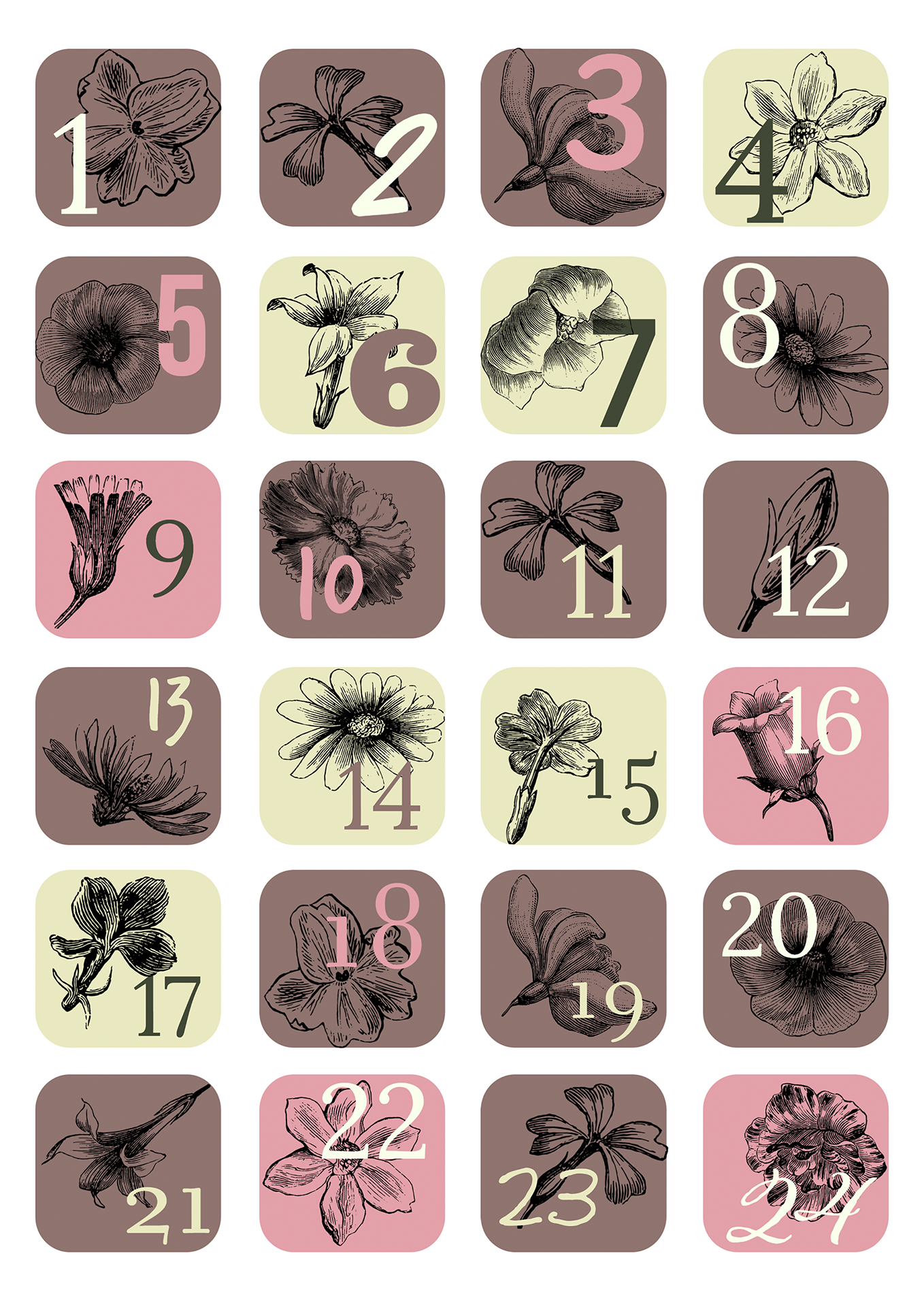 Ein Bogen mit 24 bunten, schön illustrierten Adventskalenderzahlen zum Ausschneiden.