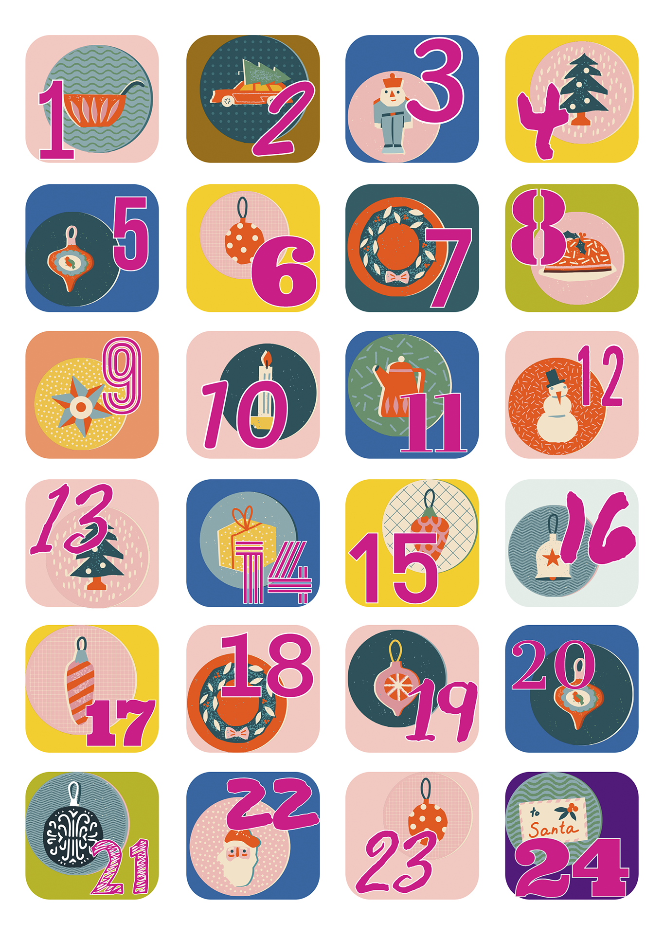 Ein Bogen mit 24 bunten, schön illustrierten Adventskalenderzahlen zum Ausschneiden. Ideal für selbstgebastelte Adventskalender. Größe Ausschneidebogen Din a4