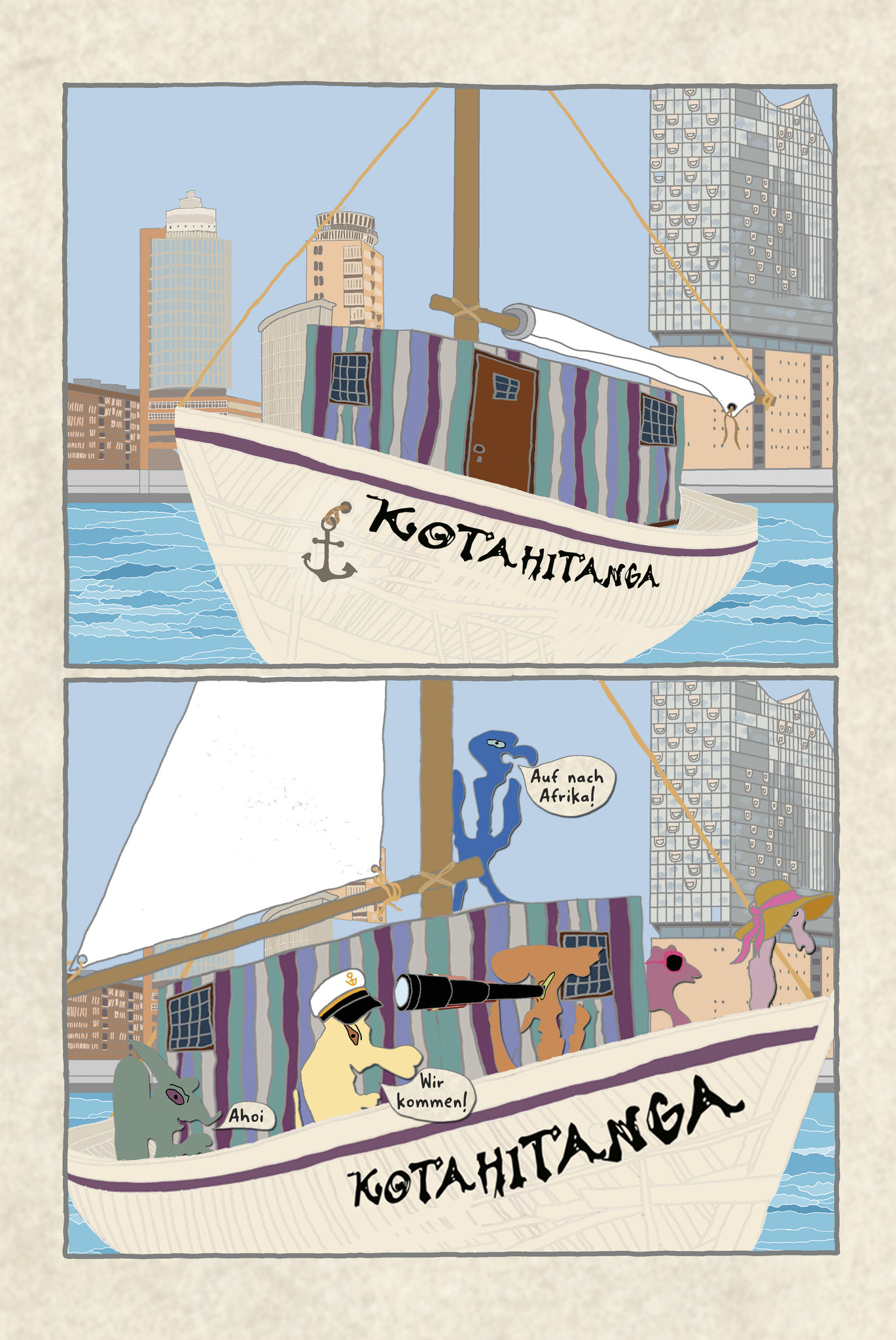 Dort treffen sie auf eine frechen Giraffe, ein verliebtes Nashorn, andere exotische Tiere und erleben spannende Abenteuer.